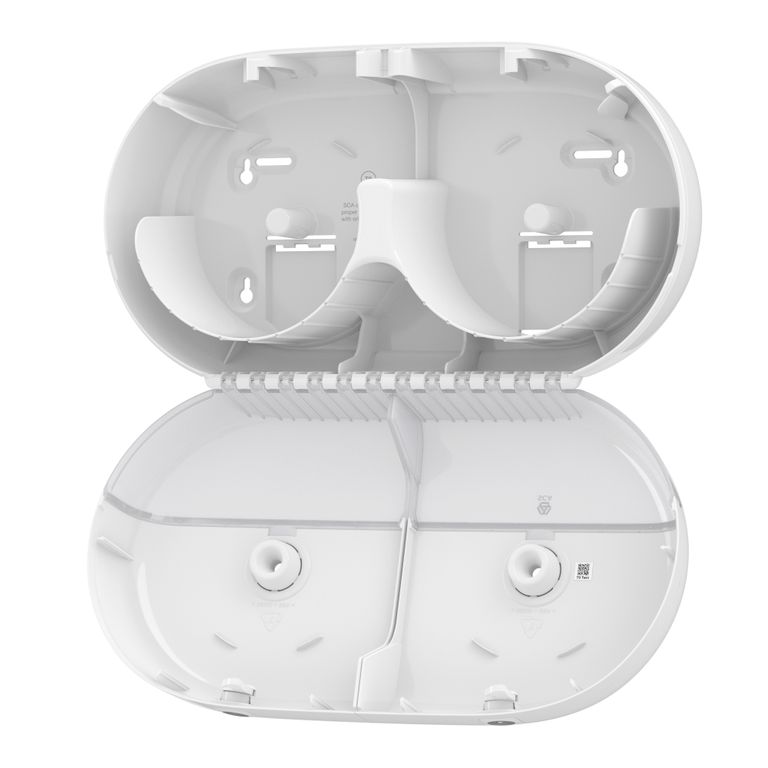 Диспенсер расcчитан на два рулона бумаги SmartOne. Подходит для туалетных комнат с большим и средним потоком посетителей.