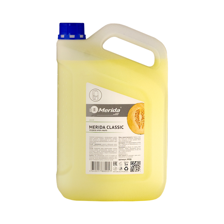Жидкое кремовое мыло Мерида ароматизированное запах дыни. Подходит для дозаторов / диспенсеров наливного типа.