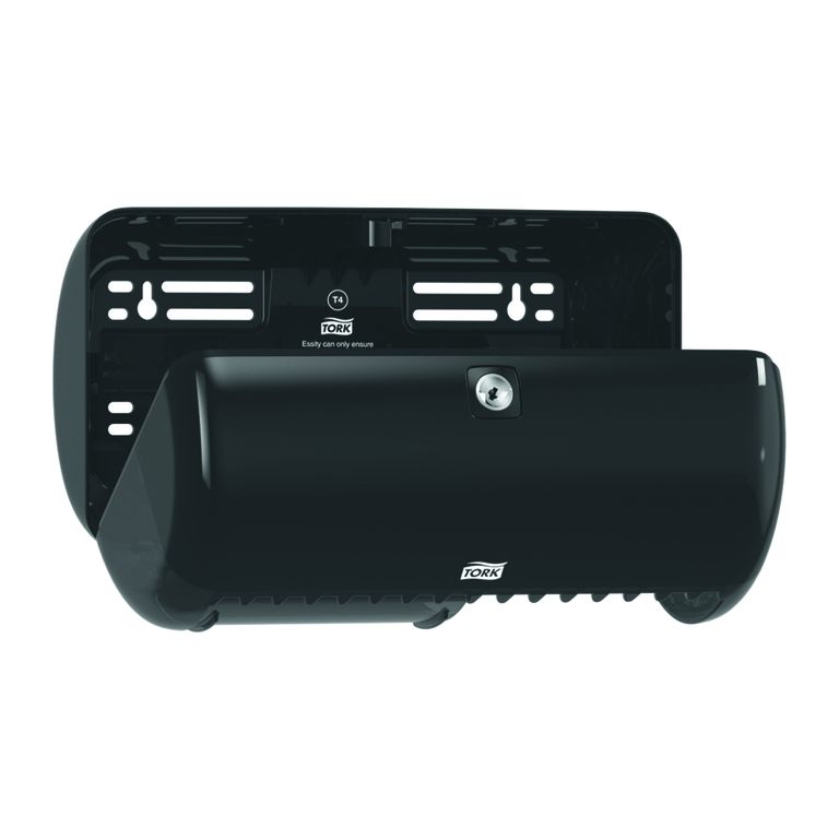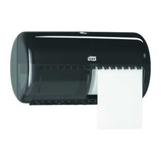 Черный пластиковый двойной диспенсер Tork, вмещаеющий 2 обычных стандартных рулона туалетной бумаги. Бумага без перфорации легко отрывается при помощи зубцов, защищается от грязи и кражи. Большое смотровое окошко облегчает контроль за наполнением. Держатель открывается с помощью ключа или нажатием на кнопку.