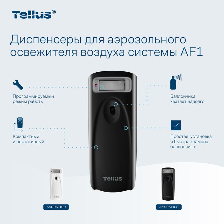 Tork Tellus диспенсер для аэрозольного освежителя воздуха прост в обслуживании и отлично вписывается в любой дизайн туалетной комнаты. Благодаря программируемым режимам распыления возможно использование в туалетных комнатах разной площади.